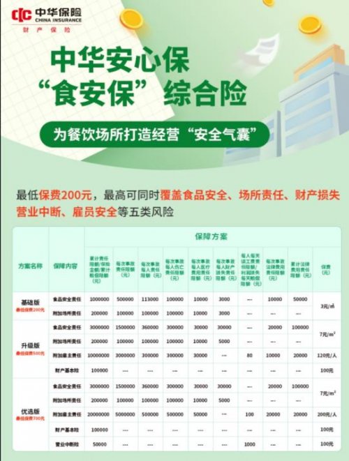 对应的 “中华安心保‘食安保’综合险” 就是餐饮人的 “经营安全气囊”:最低 200 元保费,就能同时覆盖食品安全、场所责任、财产损失等五类风险。基础版、升级版、优选版按需选,比如升级版能保到 300 万的食品安全责任,连营业中断的利润损失都能赔,花小钱给店铺焊上 “防护网”,老板才能安心搞生意。