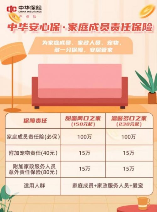 最后是家庭里的 “隐形责任”:宠物抓伤邻居、家政阿姨干活受伤…… 这些意外都可能让家庭掏腰包。“中华安心保・家庭成员责任保险”150 元起就能搞定:100 万家庭成员责任险是基础,还能加保宠物、家政责任,不管是甜蜜两口还是温馨多口之家,都能把这些 “家庭意外” 稳稳兜住。